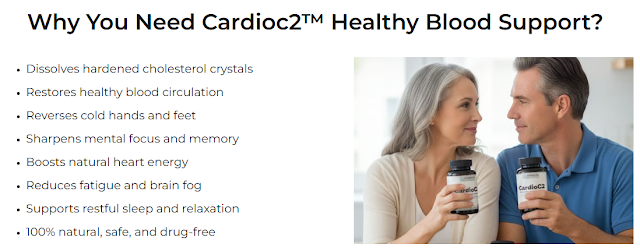 CardioC2 is marketed as a natural dietary supplement intended to support cardiovascular health, blood circulation, and overall vitality. According to the manufacturer, it works by addressing three core mechanisms: improving blood vessel flexibility & nitric-oxide mediated circulation, dissolving tiny hardened cholesterol crystals in arteries, and supporting heart cell energy production.